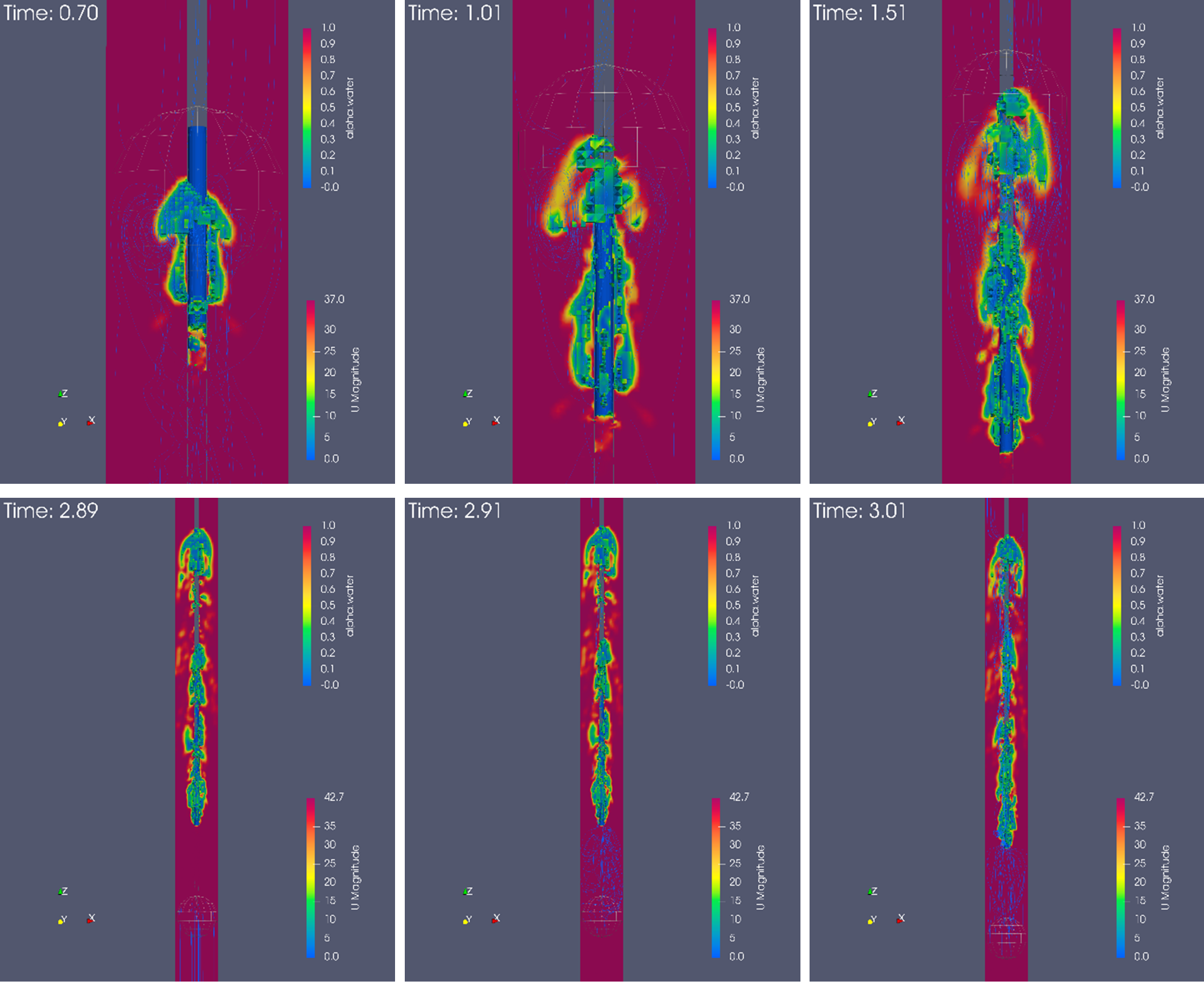 Computational Fluid Dynamics (CFD) simulation of air injection into a vertical water column (pipe immersed within water-filled shaft) generating upward water flow within the pipe.