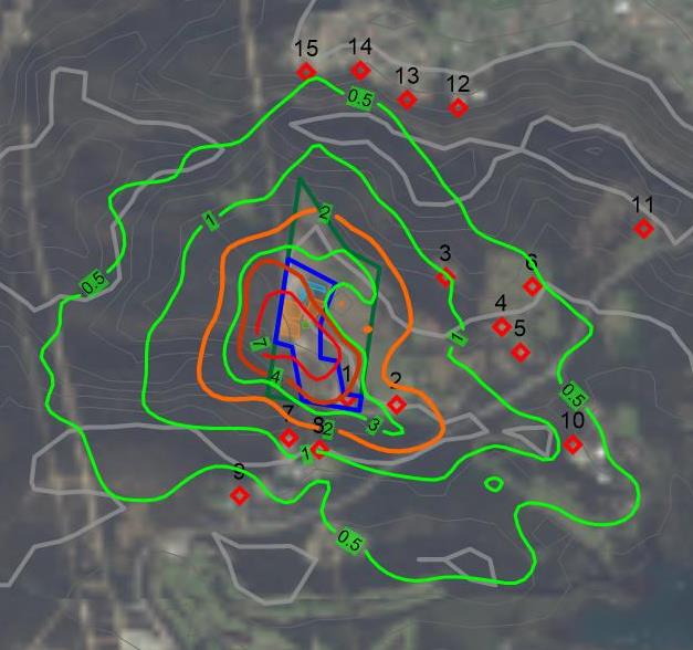Atmospheric dispersion model simulations illustrate the transport of emissions from two sources within the same region during a relatively calm winter evening.